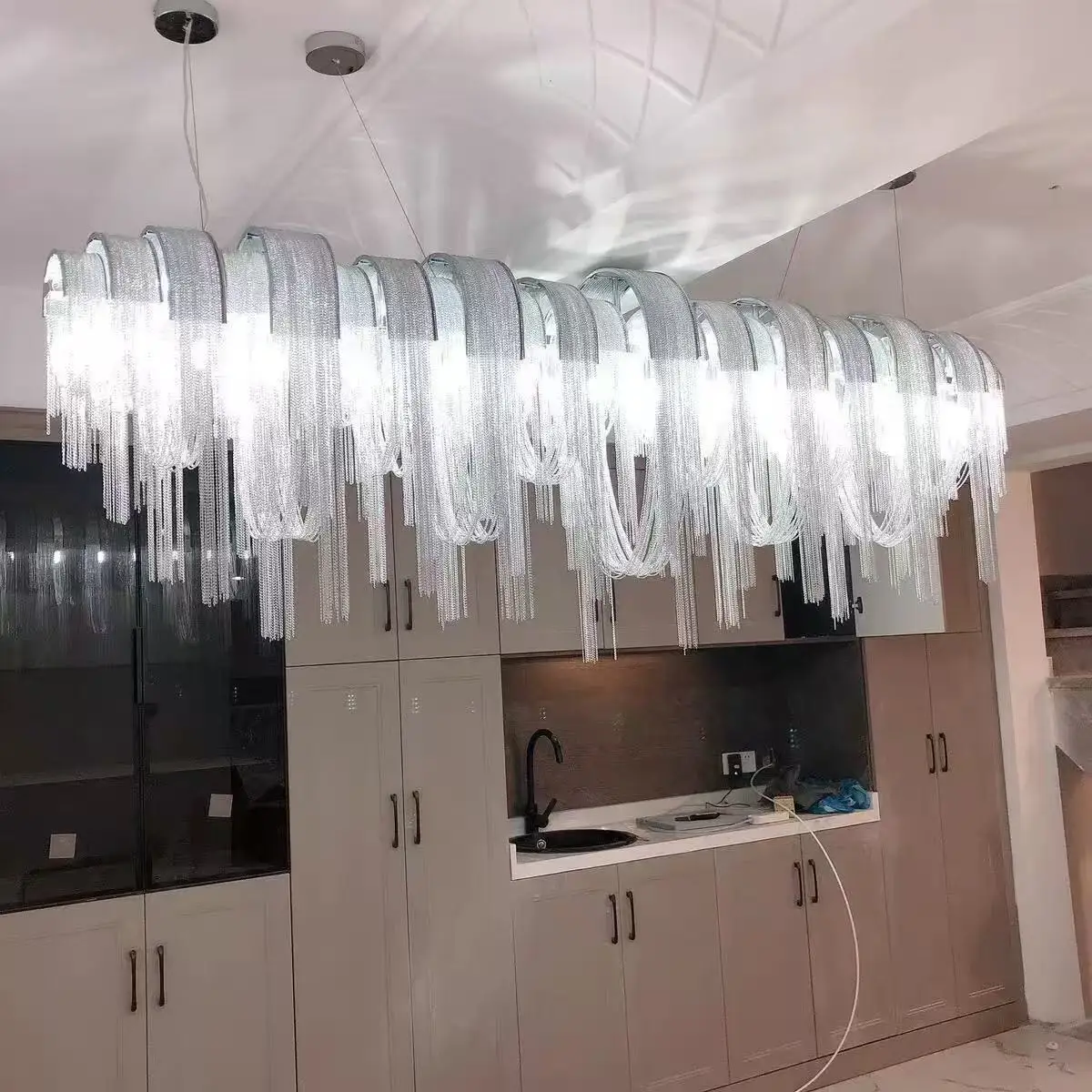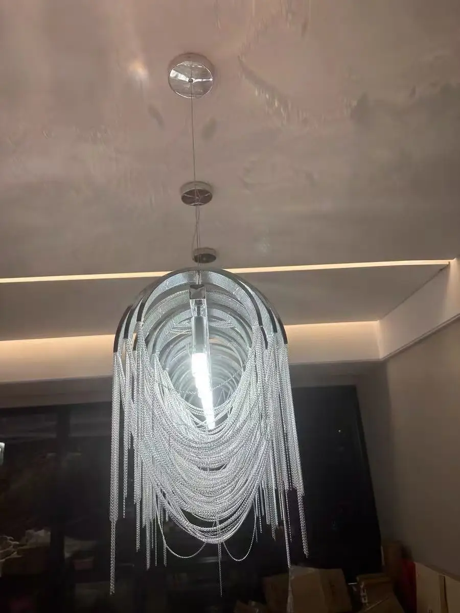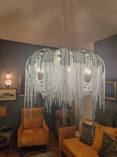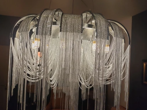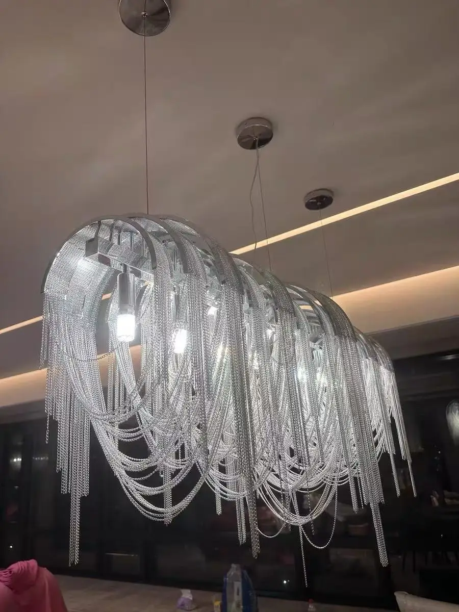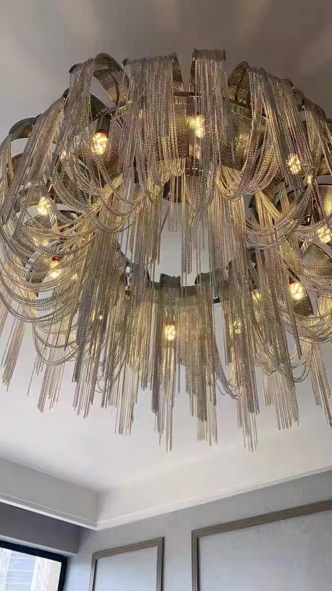Elevate with Grandeur: New Tassel French Silver Metal Chain Chandelier. Step into a realm of unparalleled elegance with New Tassel French Silver Metal Chain Chandelier, a beacon of luxury and sophistication. Adorned with intricate tassels and crafted with meticulous attention to detail, this chandelier exudes the timeless charm of French opulence. Whether illuminating a grand ballroom or gracing the halls of a luxurious estate, its radiant glow and modern design elevate any space to new heights of splendor. Enrich your home with the regal allure of this exquisite chandelier, and let its majestic presence illuminate your living space with unparalleled grandeur.